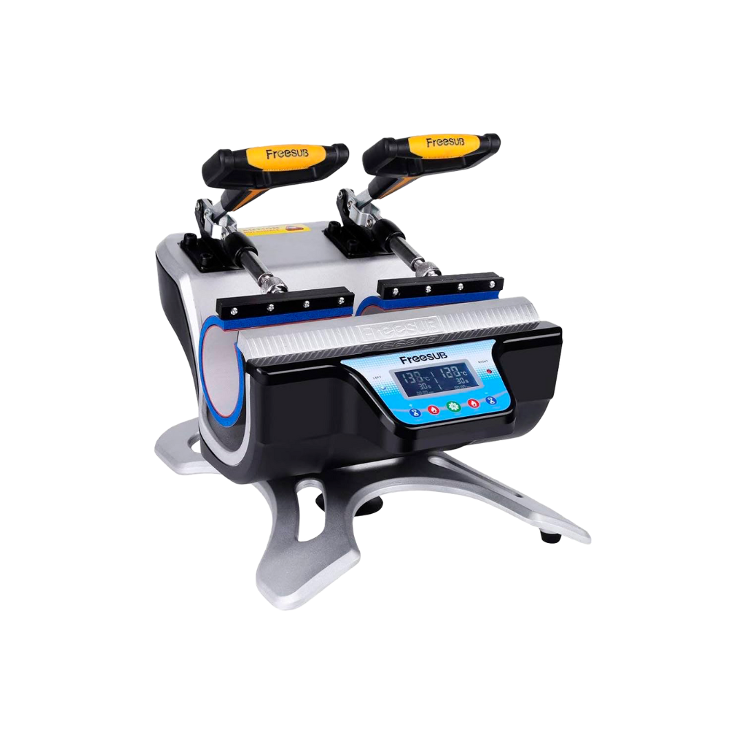 Plancha doble para tazas estándar y cónicas. Excelente presión y estabilidad para sublimaciones precisas y duraderas.